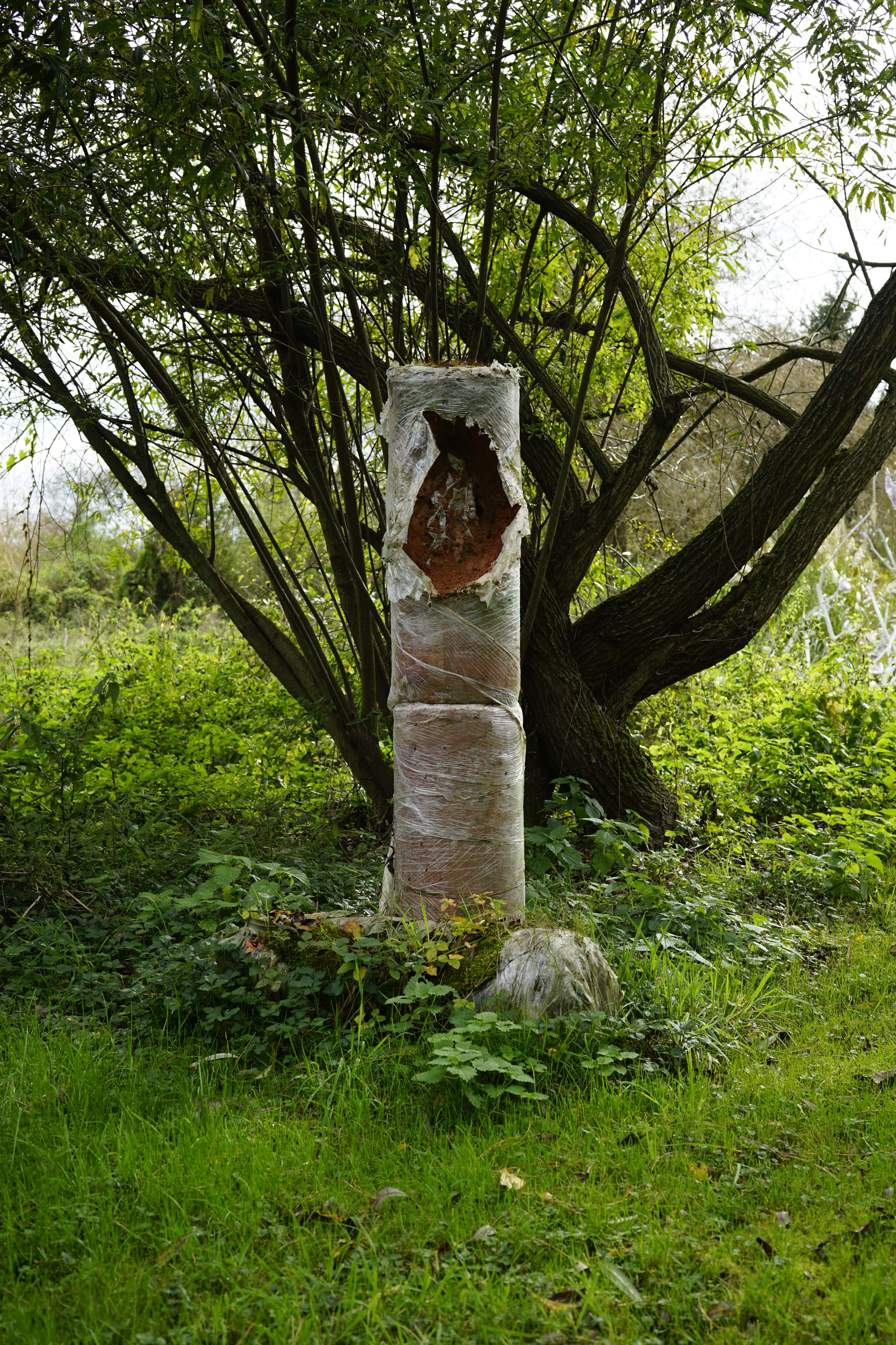 Das Kernstück der Schamottummantelung bildet ein Aluminiumguss, der in seiner Herstellung Karners Skulpturen der Samtkasten - Serie gleicht. Jenen abstrakten Werken liegt ein Modell aus heißem Wachs zugrunde, dem vom Künstler unter Wasser wie durch einen choreografischen Prozess scheinbar zufällig eine Form gegeben wird. Das Wachsmodell wird in Schamott eingefasst und bei großer Hitze stundenlang im Ofen gebrannt. Die so entstandene Gussform wird anschließend mit Aluminium ausgegossen. Während die für den Künstler markanten, in ihrer Vielfalt individualisierten Skulpturen in Farbe, Form und Größe variieren, endet bei Karners Überraschungseiern der skulpturale Schaffensprozess vor dem Herausschlagen aus der umschließenden Form. Der weitere Zustand der Skulpturen wird von der Künstlerhand in die der Akteure gelegt. Die Beteiligten können nun den Schamottzylinder mit Werkzeug abtragen und die verborgene Skulptur freilegen, in der Natur von der Verwitterung langsam öffnen lassen, diesen nur partiell oder überhaupt nicht öffnen. Karl Karner fordert auf, sich aktiv an der Skulptur zu beteiligen. So werden wir mit der Ungewissheitkonfrontiert, was den Ausgang dieses Appells betrifft. Karners Überraschungseiern liegen keine Instruktionen bei, wie mit dem von ihm erschaffenen Werk umzugehen oder fortzufahren ist. Vielmehr reversiert er die Rolle und begibt sich in eine observierende, abwartende Position, die eine Reaktion von seinem Gegenüber erwartet und dieses als nicht mehr rein voyeuristisch apostrophiert.